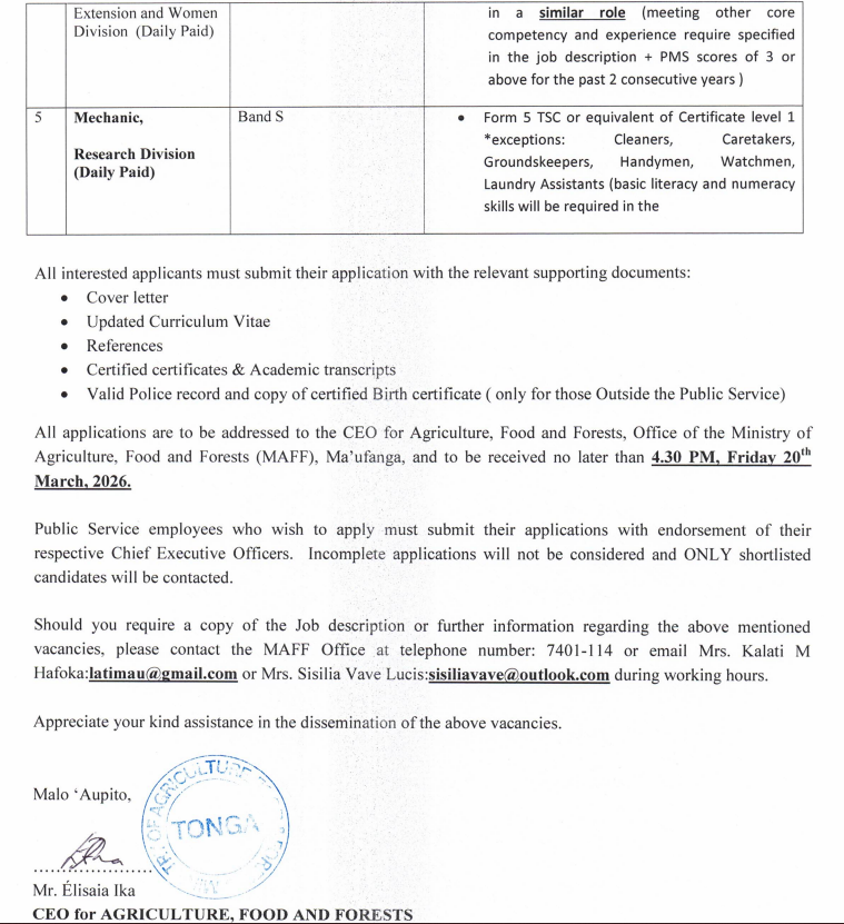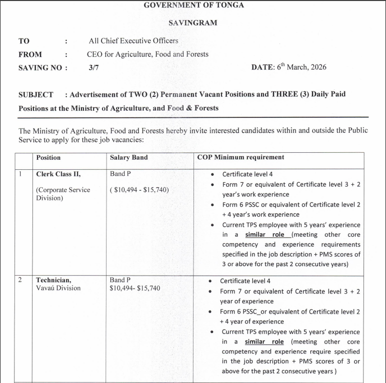 Advertisement of TWO (2) Permanent Vacant Positions and THREE (3) Daily Paid Positions at the Ministry of Agriculture, and Food & Forests. (06/03/2026)